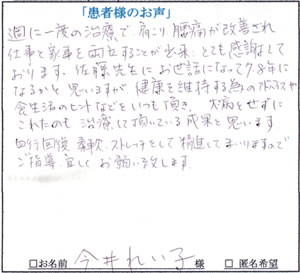 週に一度の治療で肩こり腰痛が改善され仕事と家事を両立することが出来、とても感謝しております。